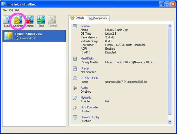 - Back in the main VirtualBox window, click Settings