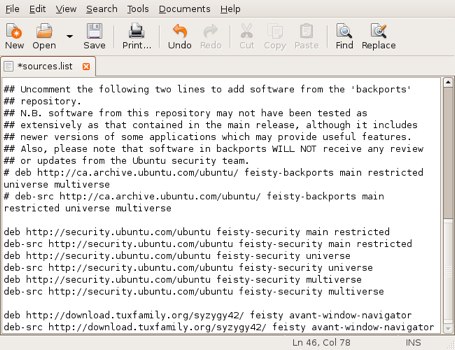 deb-src http://download.tuxfamily.org/syzygy42 feisty avant-window-navigatorand then save the file and close gedit.