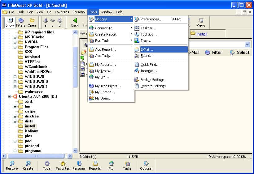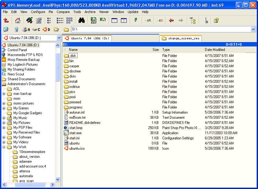 OK.. There are a lot of features. Tabs, an MP3 player, a file viewer/previewer, an FTP client.. you name it. A few um ‘complaints’ – everything is “ant”. DateAnt, AttrAnt, SyncAnt – it’s kind of annoying. I also experienced some graphics glitches – things didn’t refresh properly and parts of the preview remained even after the preview window was closed. The “MemoryLoad” in title bar is very cool, and a great way to display info without wasting space. Plus it gets credit for being donation-ware – if you like it, throw the dev some cash. He/she even has a coupons page for poor students.