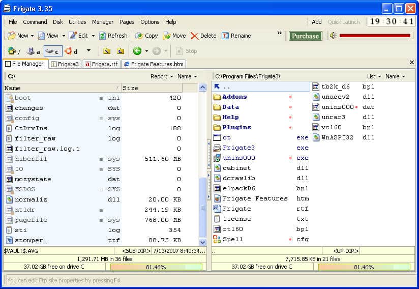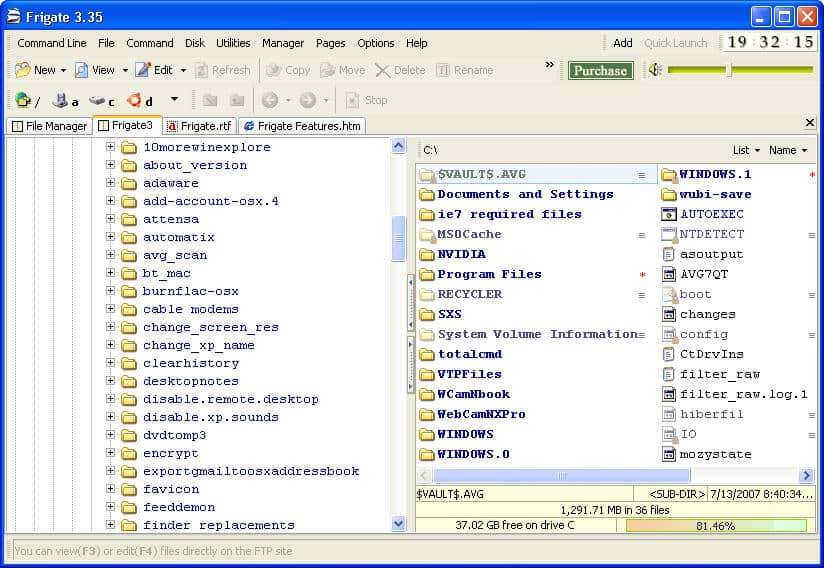 OK and now on with the good – which there actually is plenty of. The integrated FTP client works exactly as you’d expect, and it’s fast. It’s very easy to set up, and anyone at all familiar with Windows Explorer won’t be intimated by Frigate. The tabs are mandatory (for me) and the ability to have unique tabs (one for viewing web pages, one for files, one for FTP etc) is excellent. Including the time/a clock in the upper right corner is neat, and so is the fact you can change its skin or turn it off entirely. The plugins available for Frigate are solid, and I like that they’re actually separate. Rather than add bloat, you can decide if the plugin is worth installing. The plugins are: TreeNotes Manager, Startup Manager, DBF and Access editor, AVI info viewer and WinAmp control. I gave it a 3½ instead of a 4 because the forums and the comments on them make me a bit nervous that if I registered the program, I’d possibly never be able to get support for it. But again, it’s a really solid file manager.