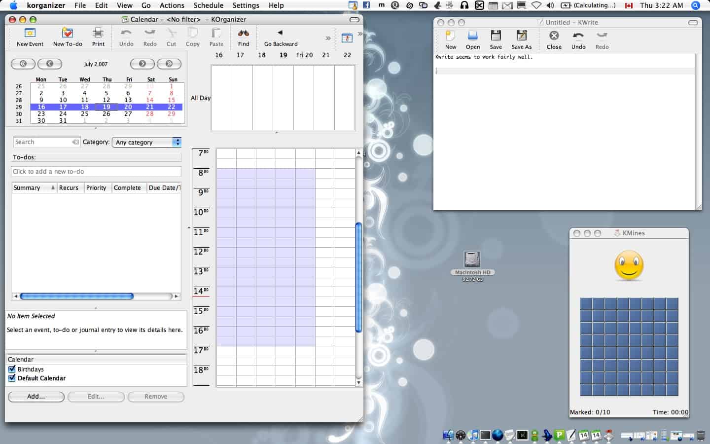 - And finally – a screenshot of KOrganizer, KWrite and KMines all running on my OS X desktop.