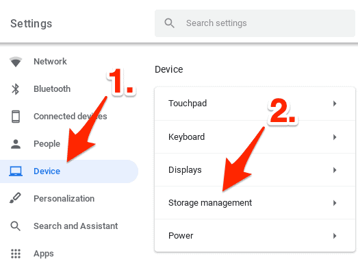 - Select Device from the navigation panel on the left side of the window, and then Storage management in the Device section on the right side of the window.